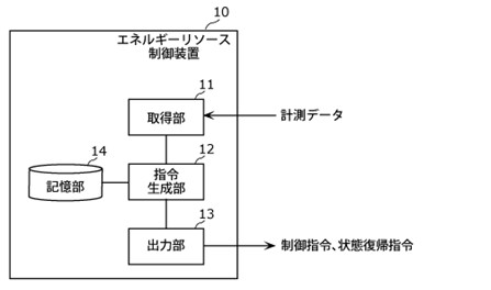 本技術は、計測データを取得する取得部 11、制御指令(電力指令メッセージ)および状態復帰指令を生成する指令生成部 12、そして指令を対象機器に送信する出力部 13(指令送信部)を中心に構成されるエネルギーリソース制御装置 10によって実現されます。指令生成部 12は、計測データや契約内容に基づいて制御指令を生成します。