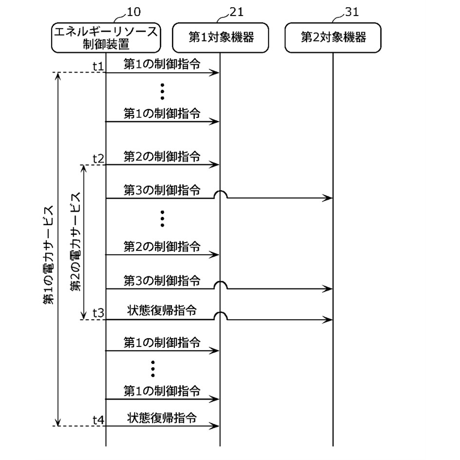 例えば、第 1の電力サービス(例:ピークカット、長期間の制御、時刻 t1から t4)の制御期間中に、第 2の電力サービス(例:デマンドレスポンス、短期間の制御、時刻 t2から t3)が終了する時刻 t3が到来した場合を想定します。
