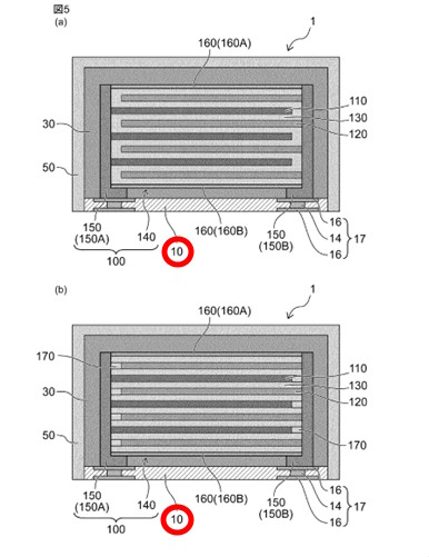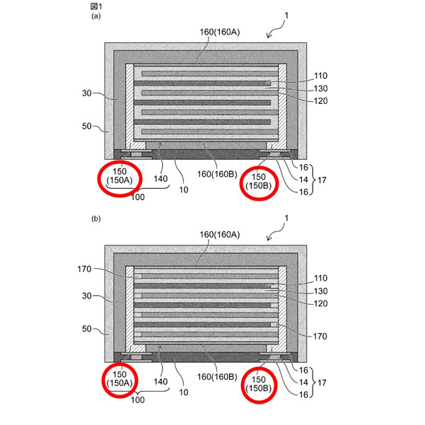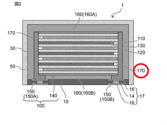 この非活性物質部(170)は、正極層(110)と負極側外部端子(150B)の間などを絶縁するために設けられる部分です。このように、積層部(140)の一部である非活性物質部(170)に吸湿材を混入させることで、水分侵入箇所により近い位置で水分を吸湿でき、より効果的に水分侵入を抑制できます。