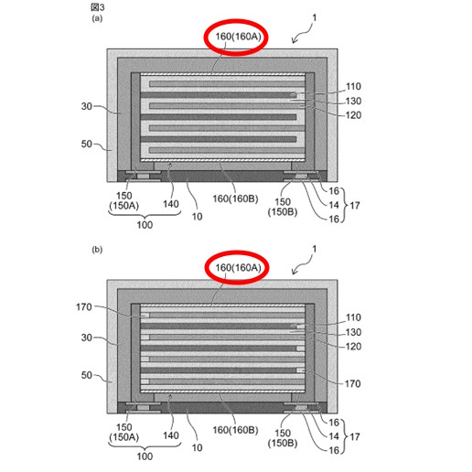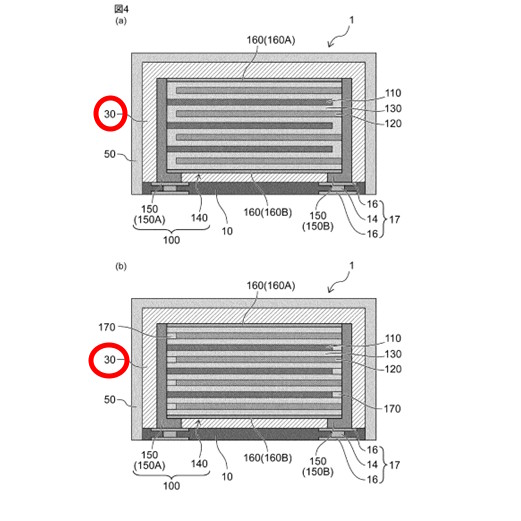 積層部(140)の側面の一部を成す非活性物質部(170)にも吸湿材を混入させることができます。