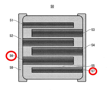 ◦ 正極側:正極集電体層51と正極活物質層52の間に、第1の中間層56を形成します。
