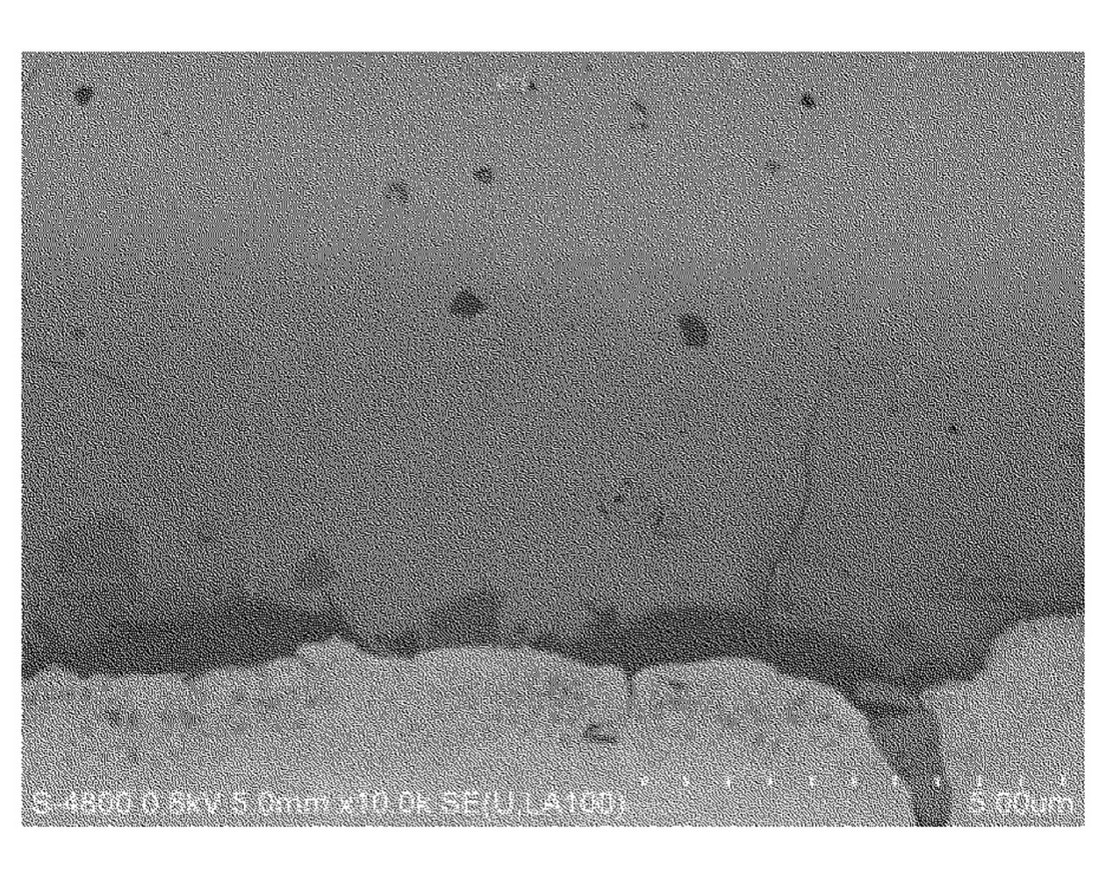 下図は、本実施形態の全固体電池における正極集電体層近傍の断面SEM像の代表例を示しており、正極集電体層と正極活物質層の間に第1の中間層が存在していることが確認できます。