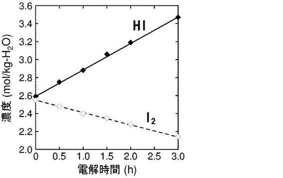 また、次の図のグラフはカソード室においてHI濃度が上昇しI2濃度が減少していることを示しています。