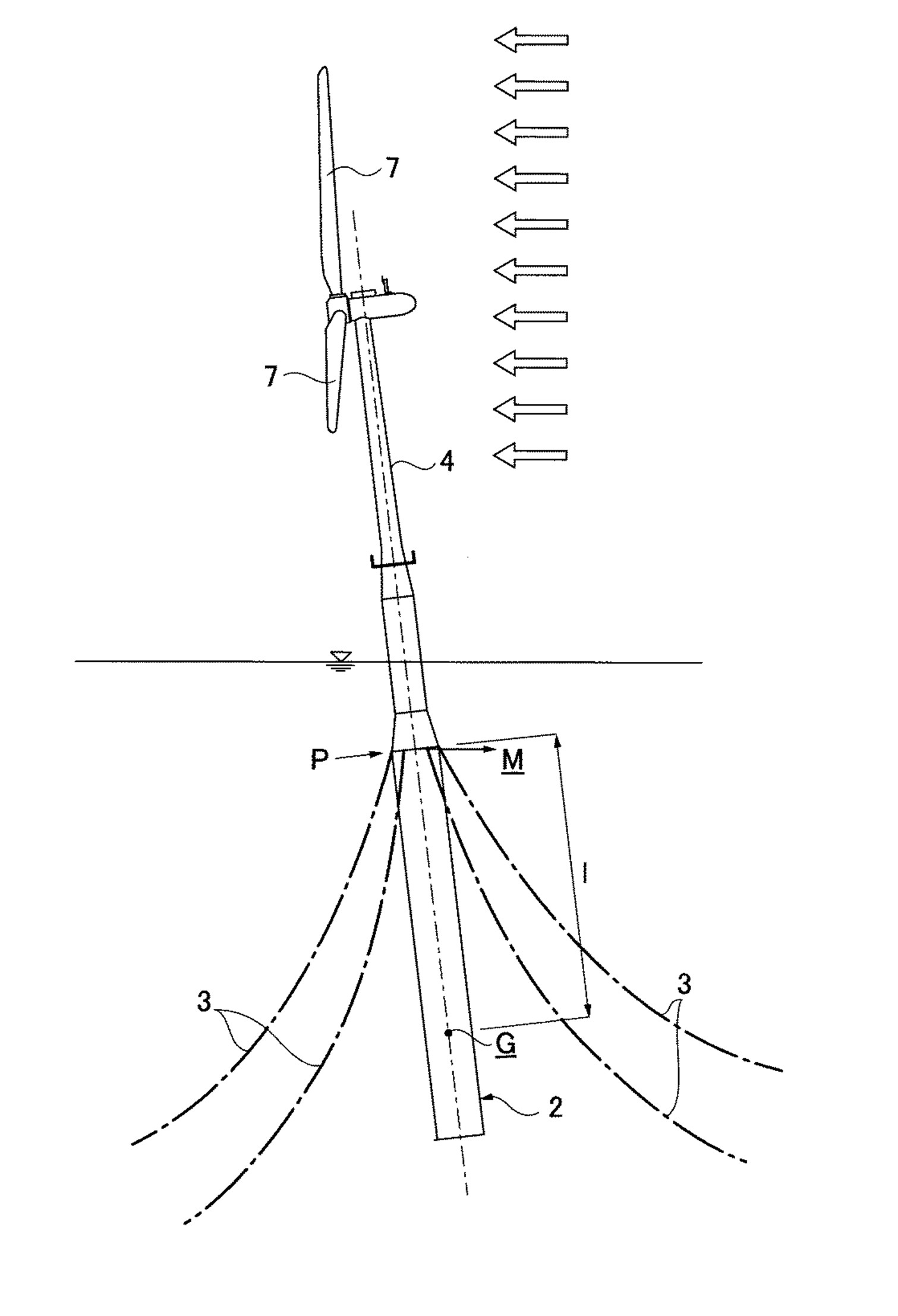 図に示されるように、係留索(3)の係留点(P)は「海面下」であり、かつコンクリートを用いたことで極めて低くなった「重心(G)よりも高い位置」に設定されています。