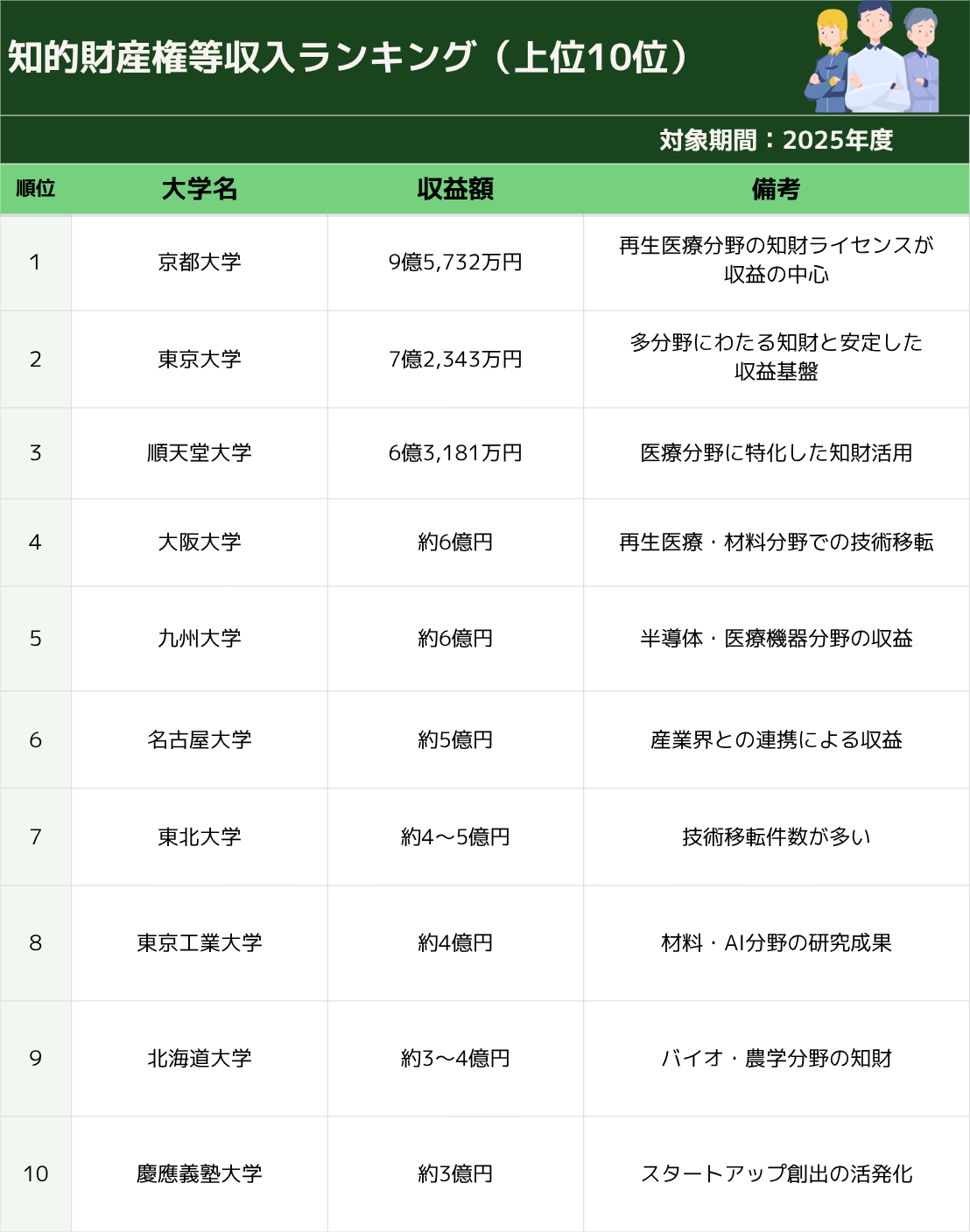 本ランキングでは、2025年における最新の知財収益データを基に、収益規模および活用戦略の観点から大学を整理し、参考情報としてランキング形式で提示しています。また、各大学の注目プロジェクトや社会実装への影響についても併せて分析しています。